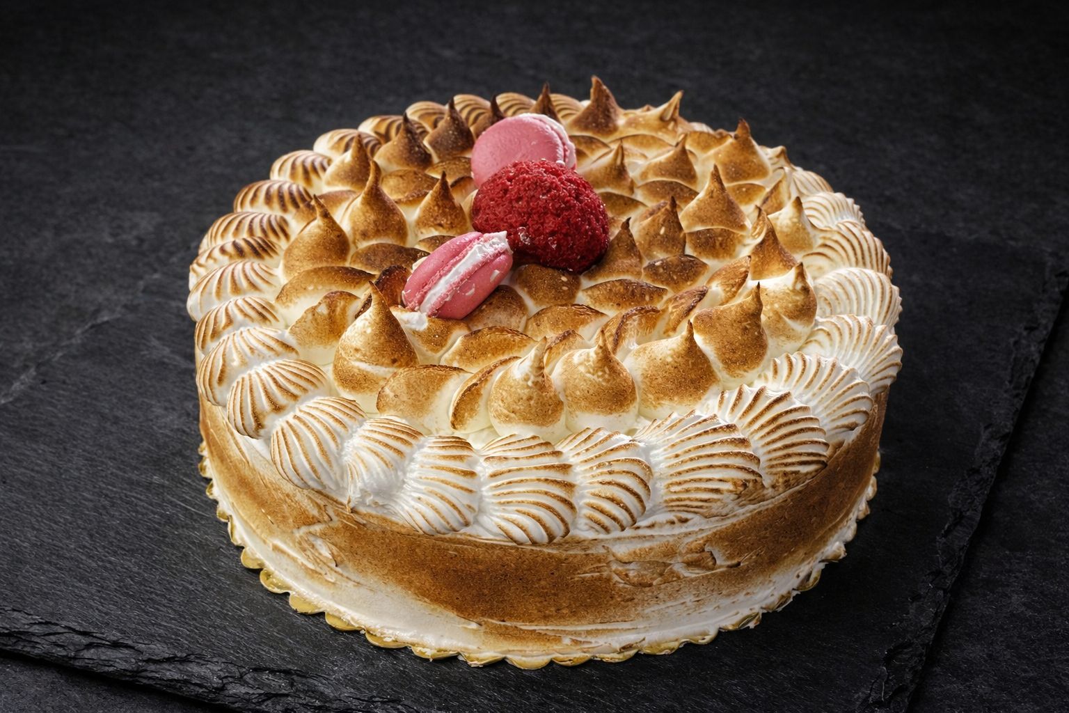 Su acabado con merengue italiano ligeramente tostado aporta un contraste elegante entre dulzura, ligereza y un sutil toque caramelizado.