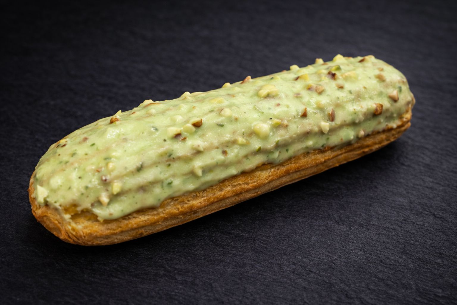 El Éclair Pistacho de Chef Laurent es una creación elegante y sofisticada, pensada para los amantes de los sabores finos.