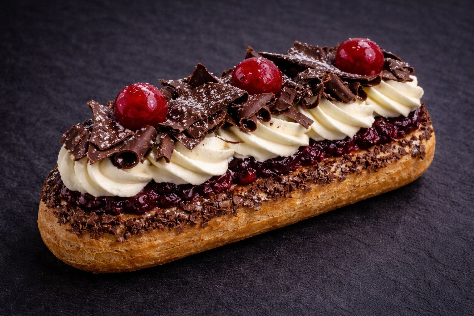 Un éclair inspirado en la clásica torta Selva Negra, con cerezas y chocolate.
